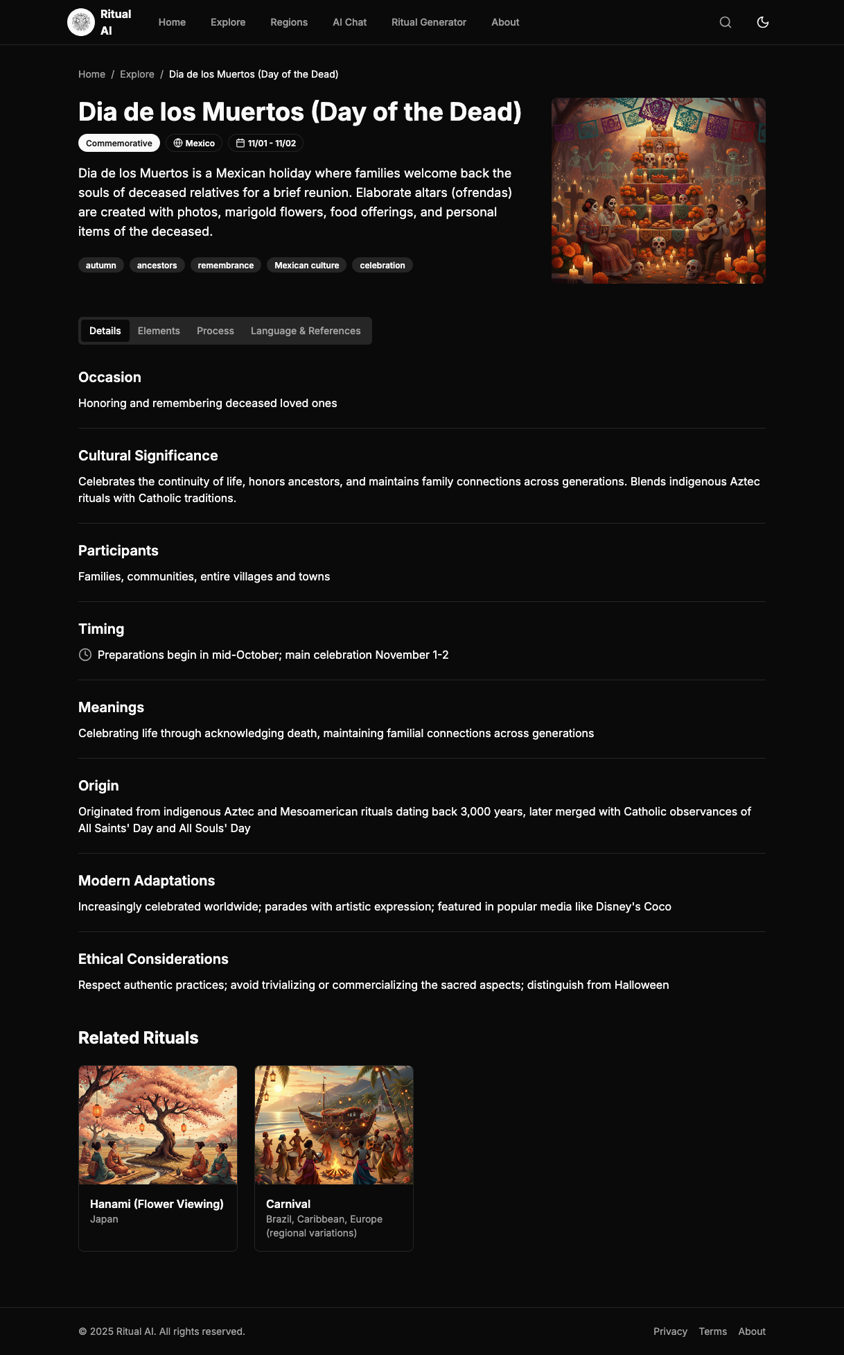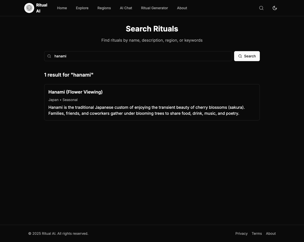 Ritual Explorer & Generator Built a sophisticated browsing system with advanced filtering capabilities and an AI-powered ritual generator that helps users understand cultural connections and create educational content.