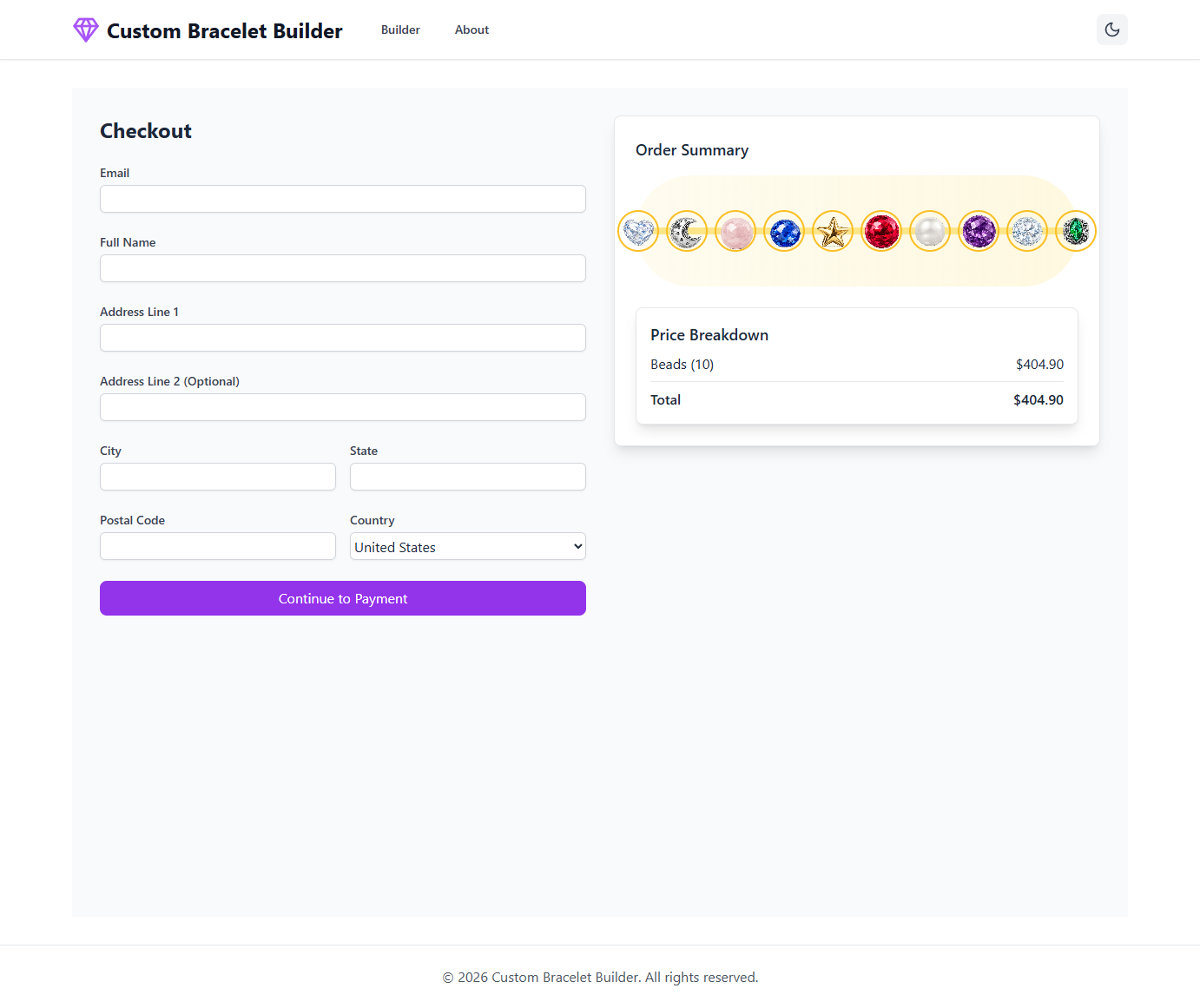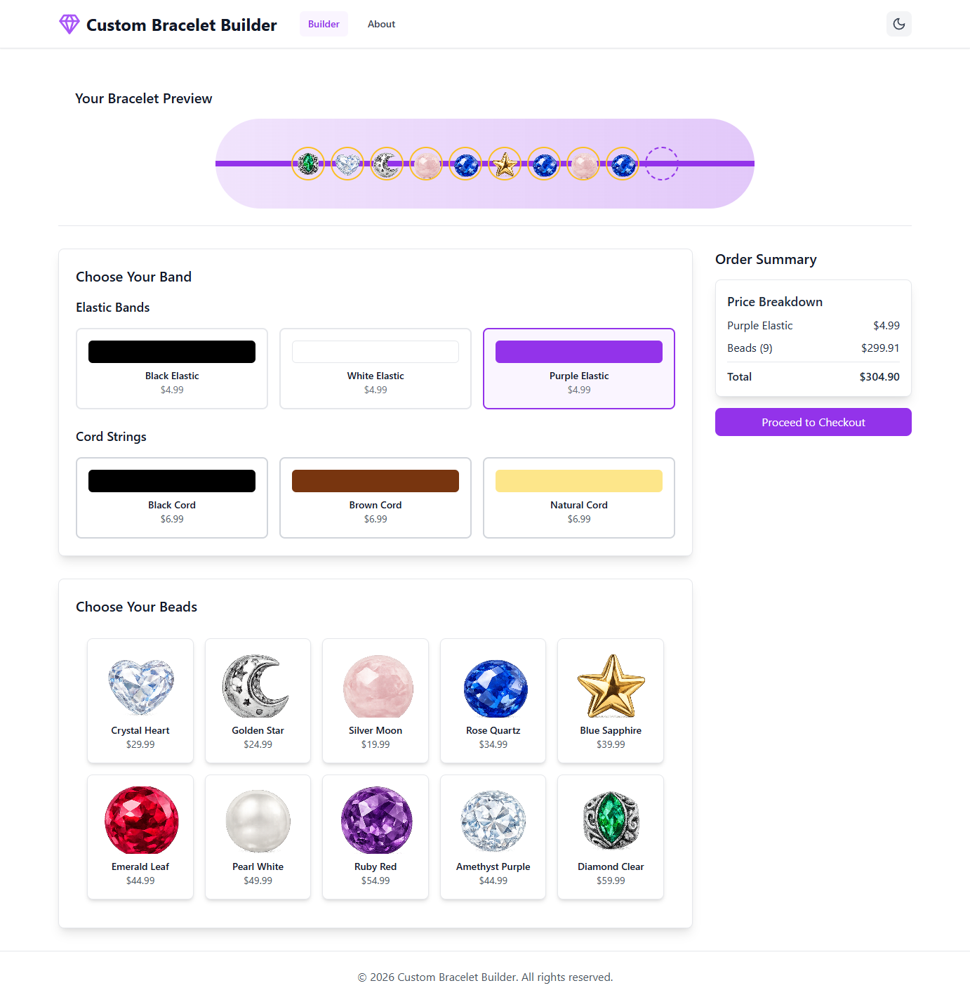 A visual bracelet customization platform that enables users to design personalized bracelets through an interactive builder. Select beads, choose bands, preview designs in real-time, and complete secure purchases all within a streamlined interface.